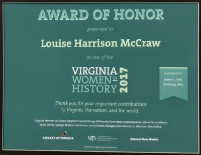 The eight women honored in 2017 are now included in the Library of Virginia’s Virginia Changemakers files. Louise McCraw’s biography can be accessed by clicking the Library of Virginia Changemakers link below.